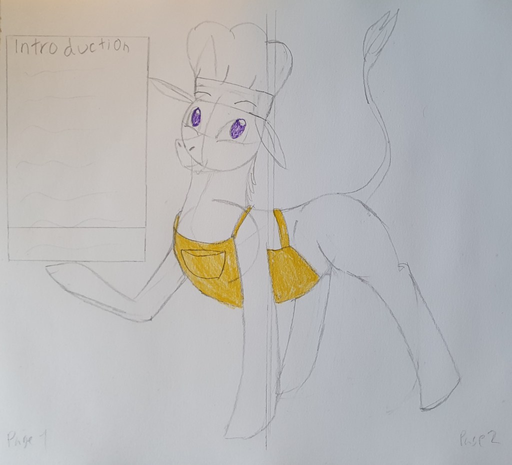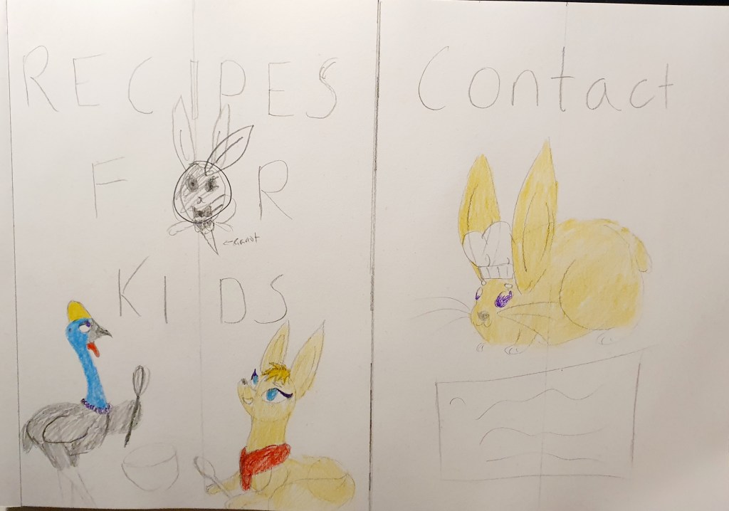 If you exclude the front, back, and introduction then there were about 6 pages that were about cooking. So I needed design for each page. Drawings or artwork where the food is people… well not complealty. They will have humanoid things.