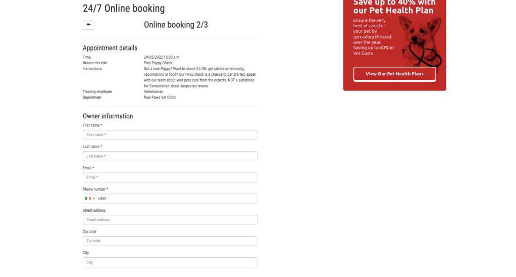 You know what, the order all of this is put in is wrong. First you should put in what type of animal you have, then what age it is, then its breed. Then its name and details. THEN personal info and appointment times. Dont spread the info. Dont allow someone to see the options Bovine and Reptile when they have already established that they want a Free Puppy Check.