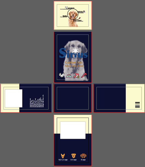 Over the last lesson tasks, I have created a logo and brochure for a dog food brand. Mine wound up being “Sirius”. This week I had to design a package for dog food, and it really bit me in the butt that my logo had such contrast in colors. I am somewhat satisfied, but it will probably change before the main Course Assignment I will be handing in.