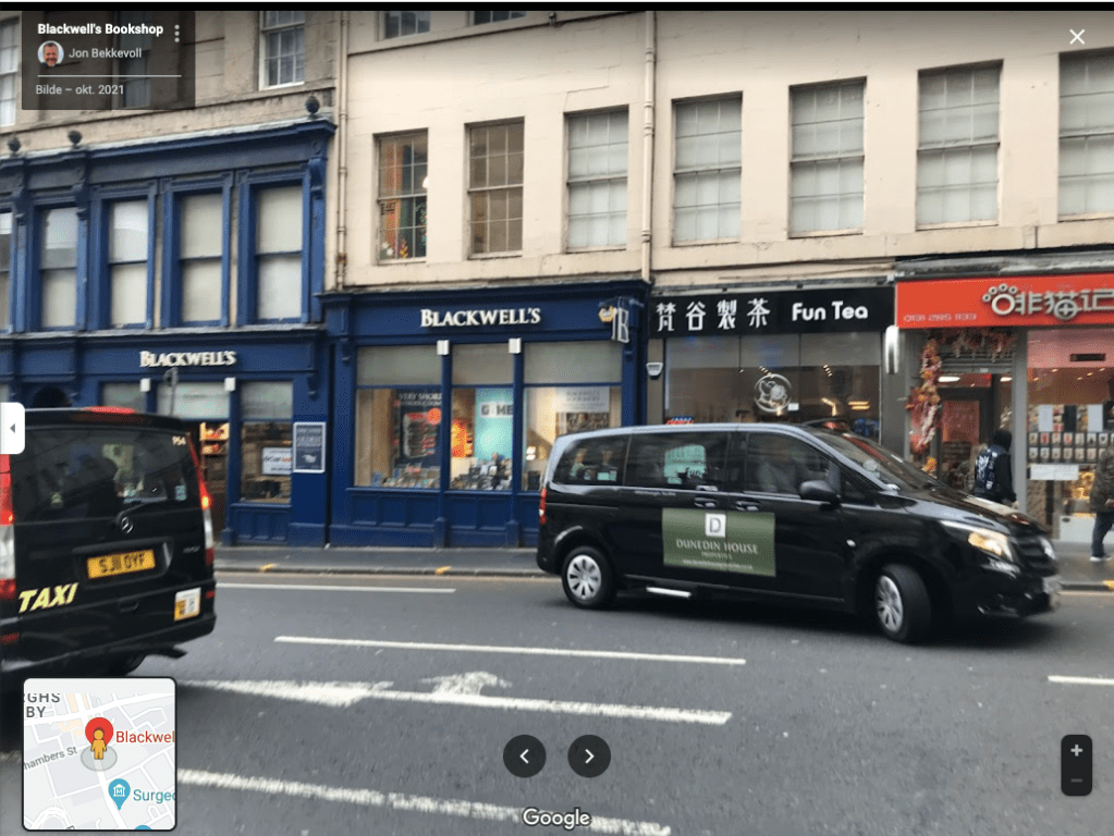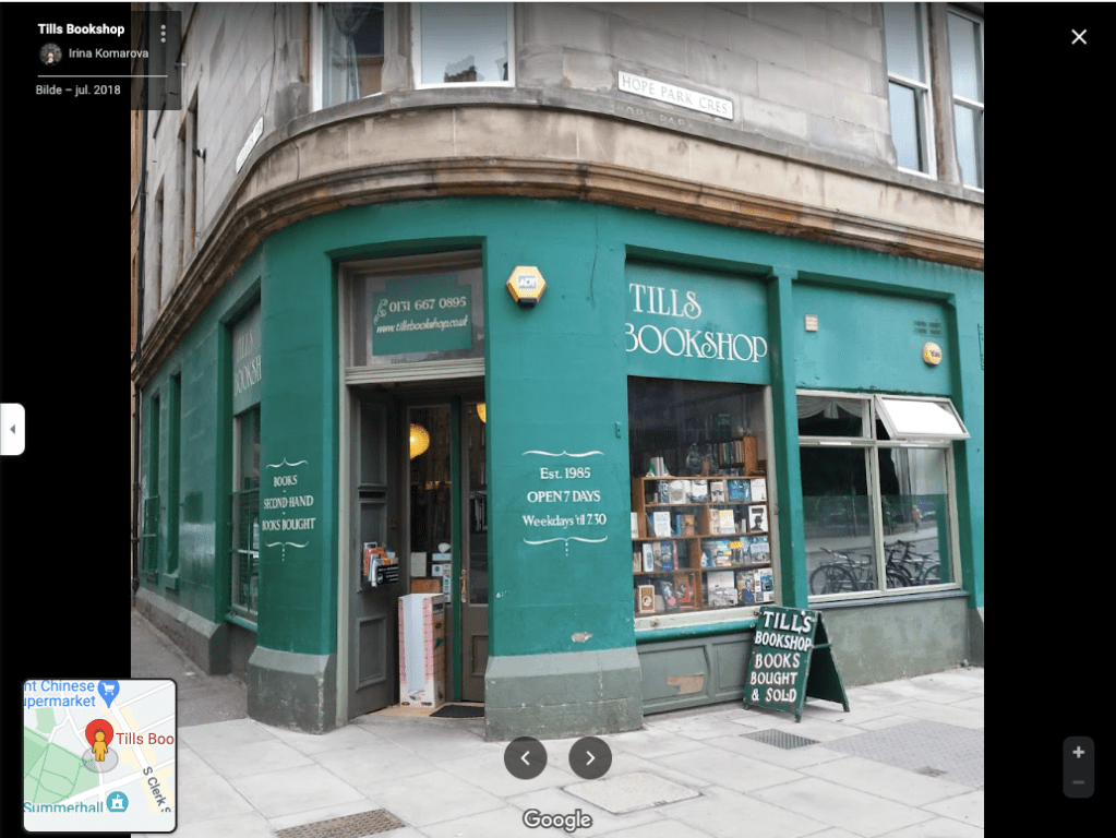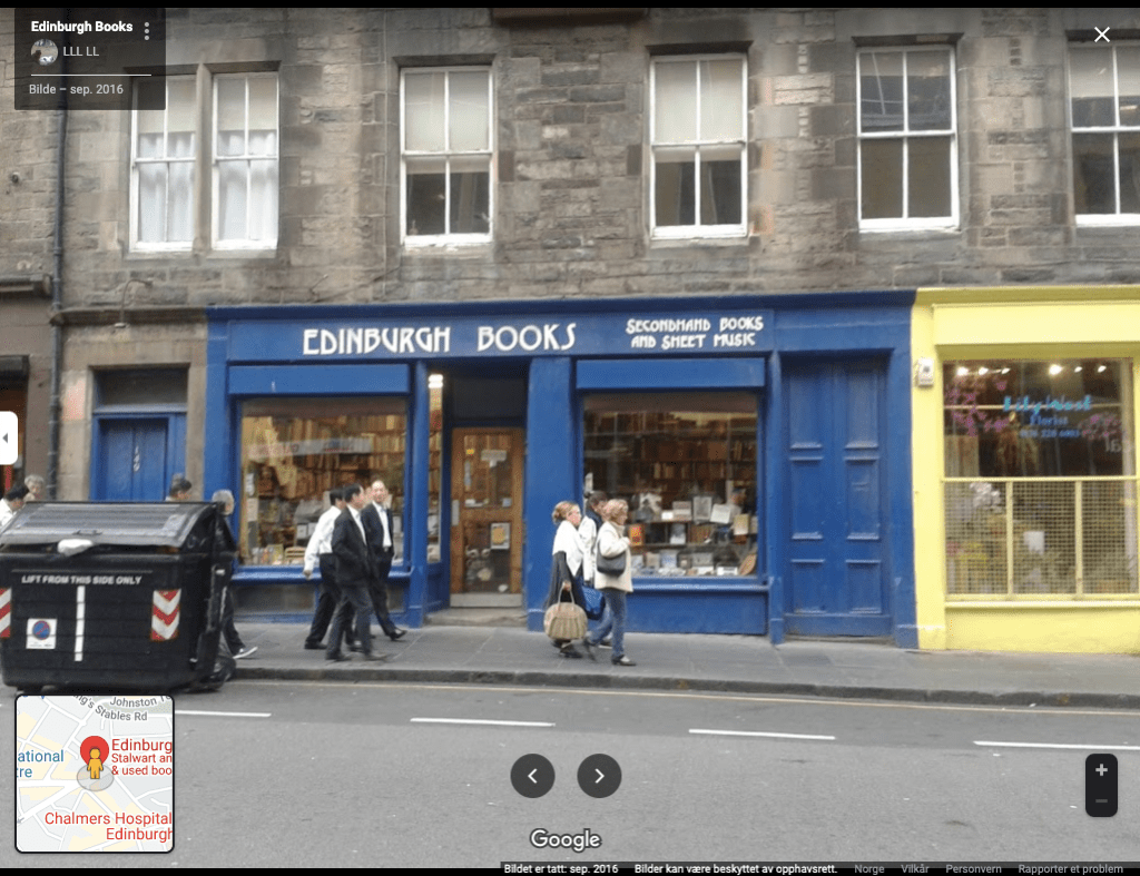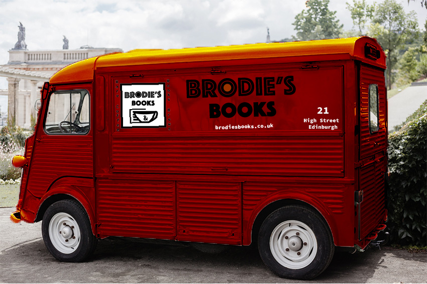 Main Pont Books, Edinburgh Books, and Armchair Books are their nearest competitors. All at most 1 minute by car away from Brodies Books. Edinburgh is blue and white, Armchair is green and golden, Main is cream and black, at least on the outside. No logos seen on the outside. Therefore I would want to stay away from blue, green, and cream as a main color.