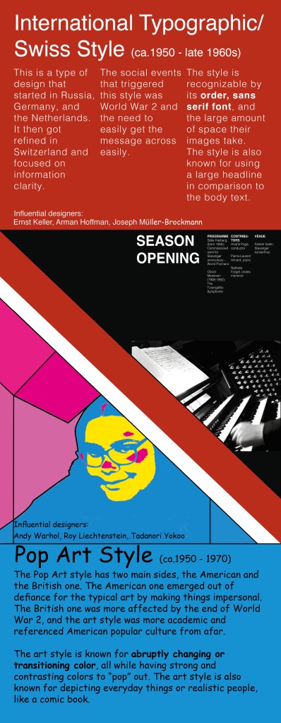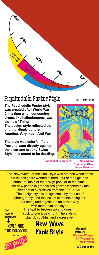 Those four periods were: International Typographic Style/Swiss Style, Pop Art Style, Psychedelic Poster Style, and New Wave/Punk Style. Each of these four periods will get a few lines of information, as well as some artists/designers from that style, mentioned and explained.