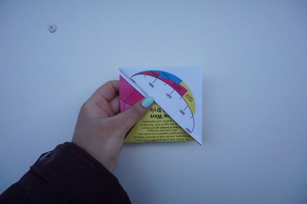 Task: You need to make a creatively folded leaflet with visually striking graphics telling the story of four styles in graphic design from 1950-1980. You will use your own content (text and images) to create an interesting timeline or infographic to illustrate the various periods and styles in graphic design.