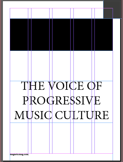 I added the Mast Head area, “The Voice of Progressive Music Culture” and marked the area where the words “Free”, “Summer 2023” and the website name. I decided to let the Wordmark be due to how I love the look and its masculine and modern feel. It fits its demographic and is easily read.