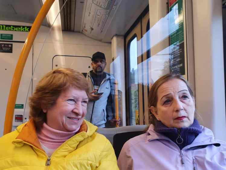 Dette portrettet er navngitt «Gul og Lilla» etter fargene på de to venninnene. Lokasjon er også T-bane Linje 5, Oslo, i retning sentrum.