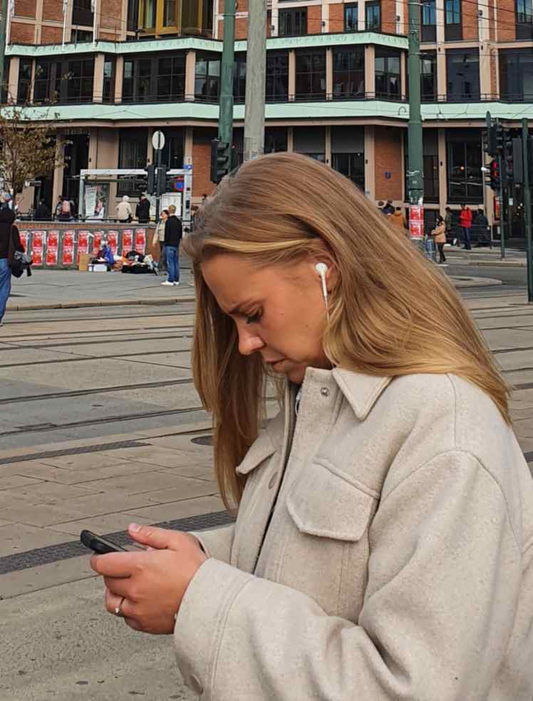 Dette portrettet er navngitt «Beige Bekymring» grunnet uttrykket personen har når hun ser ned på mobilen. Lokasjonen er Jernbanetorget, Oslo. Jeg hadde en bygning med masse former bak, og der stod jeg og ventet til jeg så noen med en klar historie å fotografere.